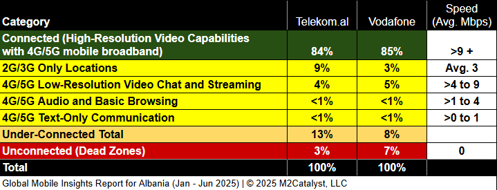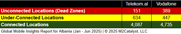 • Telekom.al has the lowest Dead Zone location percentage at 3%.