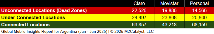 • Movistar has the greatest Dead Zone location percentage at 23%, while the other MNOs range between 14% and 20%.