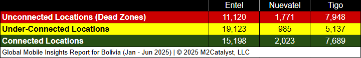 • Tigo and Nuevatel have the greatest Dead Zone location percentage at 38% and 37%, respectively.