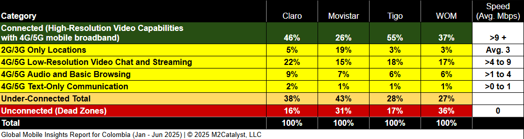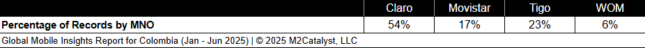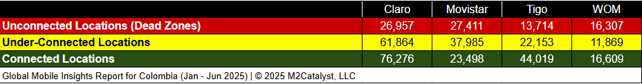• Tigo and Claro have the greatest connected location percentages at 55% and 46%, respectively.