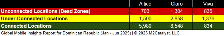 • Altice has the lowest under-connected location percentage at 19%, while the other MNOs range between 23% and 45%.