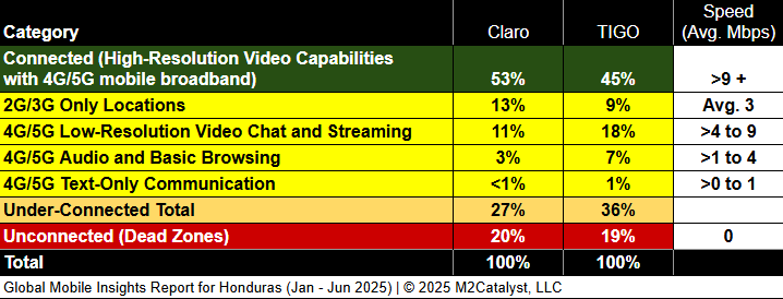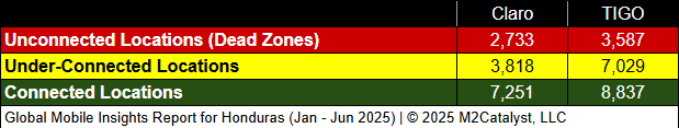 • Claro has the greatest connected location percentage at 53%, while also having the lowest under-connected location percentage at 27% in our dataset.