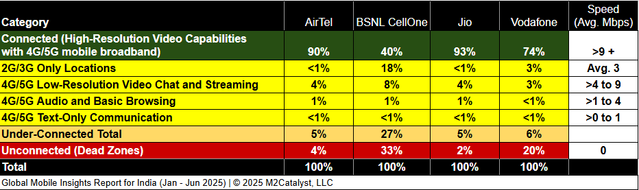 • BSNL CellOne has the greatest under-connected and Dead Zone location percentages.