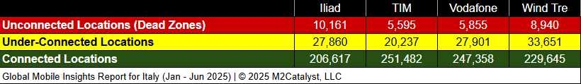 • Iliad has the greatest Dead Zone location percentage at 4%, while all other MNOs range between 2% and 3% with TIM having the lowest percentage (without rounding).