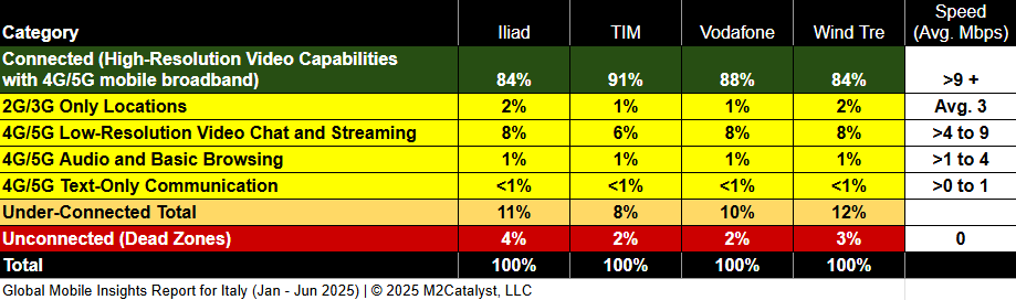 • TIM has the lowest under-connected location percentage at 7%, while all other MNOs range between 10% and 12%.