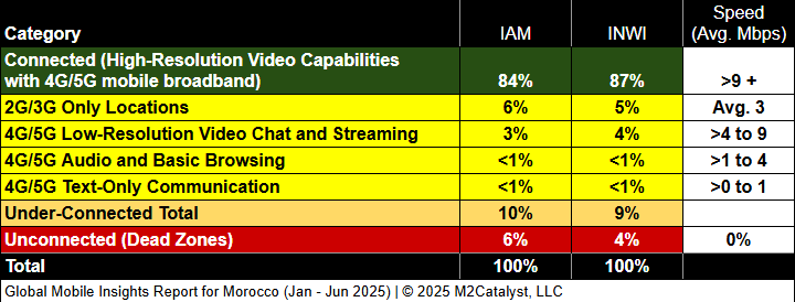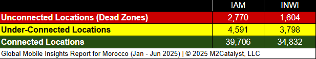 • INWI has the greatest connected location percentage at 87%, while also having the lowest Dead Zone location percentage at 4% in our dataset.