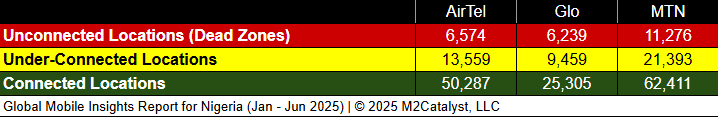 • This study identified a minimum of 11,276 and a maximum of 24,089 unconnected bins (Dead Zones aka Not-Spots), depending on the degree of overlap. This represents between 9% and 19% of the unique bin count (locations reporting at least one quality reading from any of the MNOs in the study).