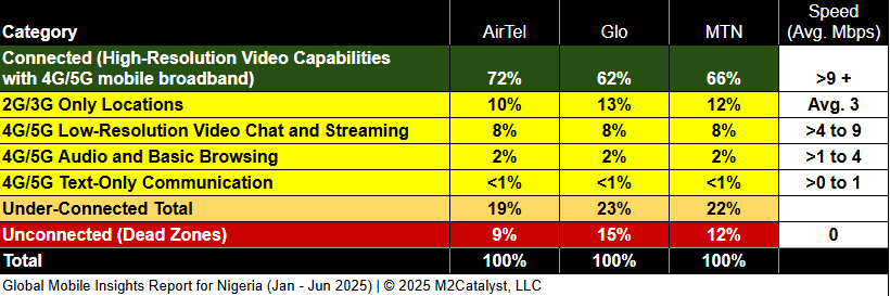 M2’s proprietary Mobile Broadband Quality algorithm comprehensively evaluates various factors, including signal strength, signal quality, and throughput, across (1) the 4G/5G service footprint for each country's national Mobile Network Operators (MNOs), (2) the 2G/3G-only service footprint for each MNO, and (3) areas where mobile devices are active but unable to detect any service. Within the M2 dataset, each 1km bin with mobile activity is then assessed to determine the highest mobile use case it can support, resulting in its classification as Connected, Under-Connected, or Unconnected.