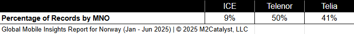 • Telenor has the greatest connected location percentage at 92% and ICE has the lowest at 86%.