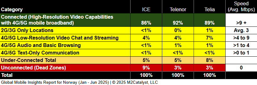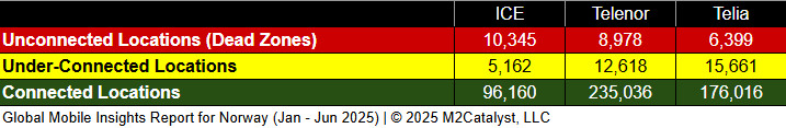 • ICE has the greatest percentage of Dead Zones but the lowest percentage of under-connected locations (without rounding) in our dataset.