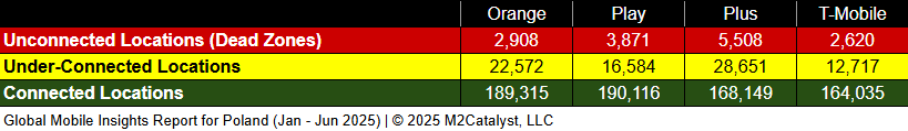 • All MNOs have relatively similar Dead Zone location percentages with Plus having the greatest at 3% in our dataset.