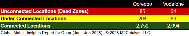 • Both MNOs have relatively similar Dead Zone location percentages with Ooredoo having the least (without rounding) in our dataset.