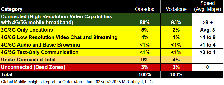 M2’s proprietary Mobile Broadband Quality algorithm comprehensively evaluates various factors, including signal strength, signal quality, and throughput, across (1) the 4G/5G service footprint for each country's national Mobile Network Operators (MNOs), (2) the 2G/3G-only service footprint for each MNO, and (3) areas where mobile devices are active but unable to detect any service. Within the M2 dataset, each 1km bin with mobile activity is then assessed to determine the highest mobile use case it can support, resulting in its classification as Connected, Under-Connected, or Unconnected.