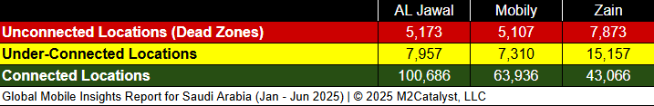 • Zain has the greatest under-connected location percentage at 23% and the greatest Dead Zone location percentage at 12%.