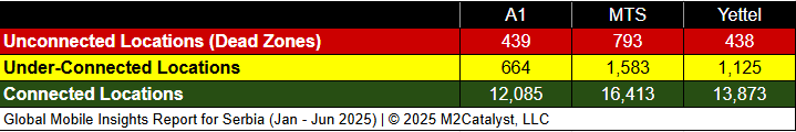 • A1 and Yettel have the lowest under-connected location percentages at 5% and 7%, respectively, while MTS has 9%.
