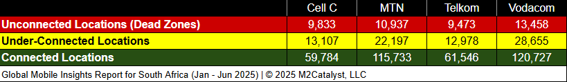 • Vodacom has the greatest under-connected location percentage at 18%, while all other MNOs range between 14% and 16%.