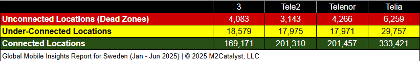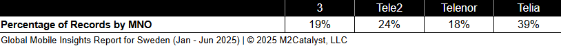 • Tele2, Telenor, and Telia have relatively similar connected location percentages with Tele2 having the greatest (without rounding) in our dataset.