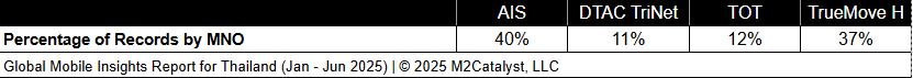 • AIS has the greatest connected location percentage at 93%, while all other MNOs range between 87% and 92% in our dataset.