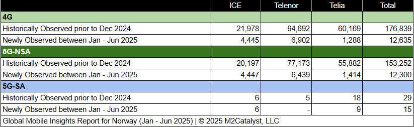• M2’s dataset for the 1st half of 2025 contains 24,950 newly observed 4G/5G mobile broadband Cell IDs. A more in-depth view of the Cell IDs and their associated details by location over time can be visualized on M2's Crowd SiteIntel platform.
