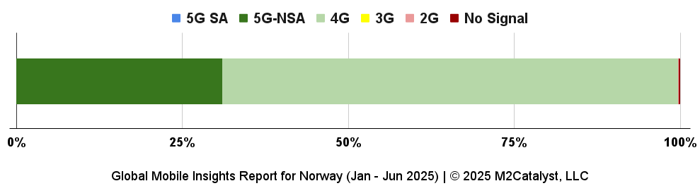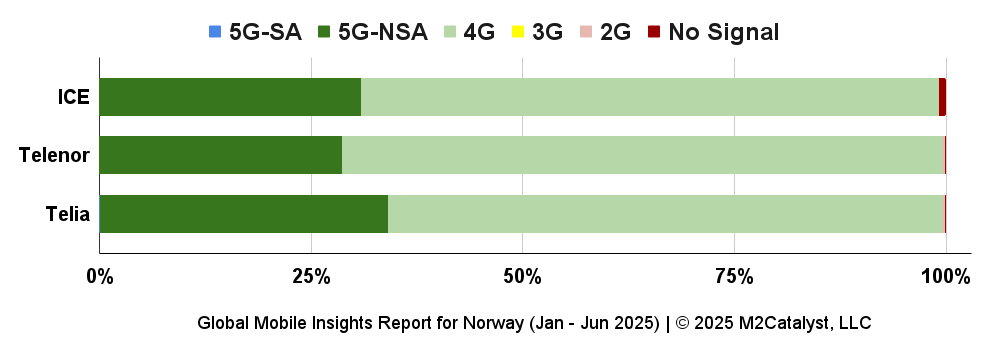 • ICE has 0.84% of its users reporting no signal while Telenor and Telia have less than 0.20% of their users reporting no signal.