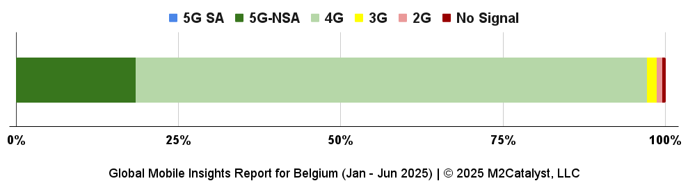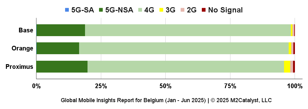 • Proximus shows the largest percentage of users with no signal, followed by Orange, and then Base.