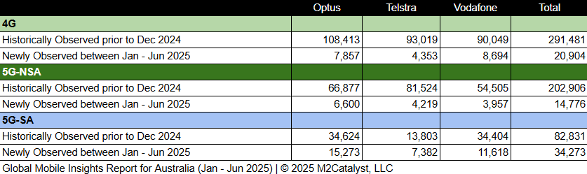 • The number of 5G-SA Cell IDs is approximately 49% of the newly observed Cell IDs with Optus contributing over 45% of those.
