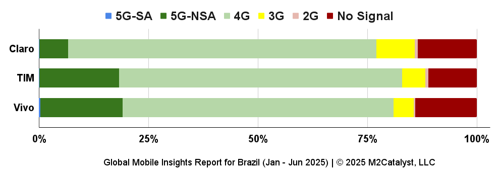 • TIM has the lowest percentage with 11% of their users reporting no signal while Vivo has the greatest percentage with 14% of their users reporting no signal.