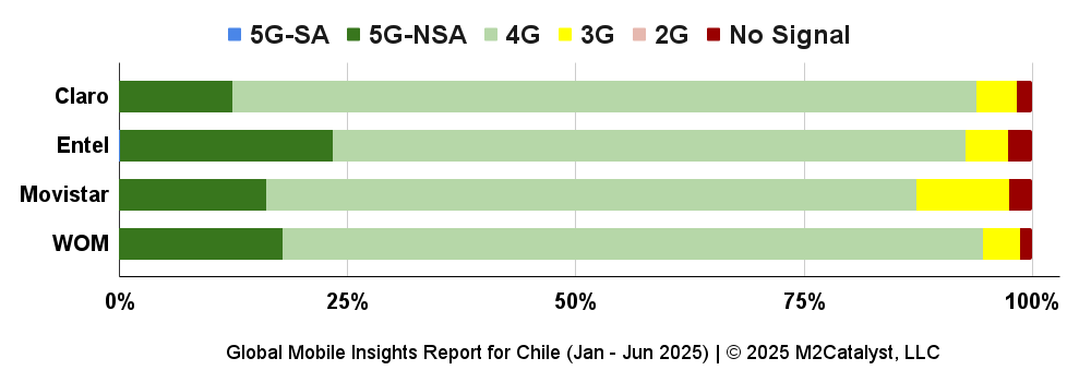 • WOM has the lowest percentage with 1% of their users reporting no signal while Entel has the greatest percentage with 3% of their users reporting no signal.
