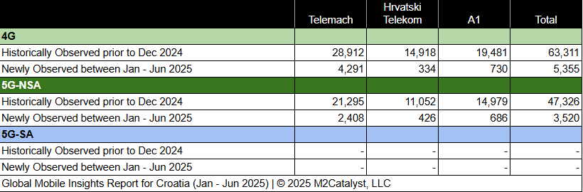 • M2’s dataset for the 1st half of 2025 contains 8,875 newly observed 4G/5G mobile broadband Cell IDs. A more in-depth view of the Cell IDs and their associated details by location over time can be visualized on M2's Crowd SiteIntel platform.