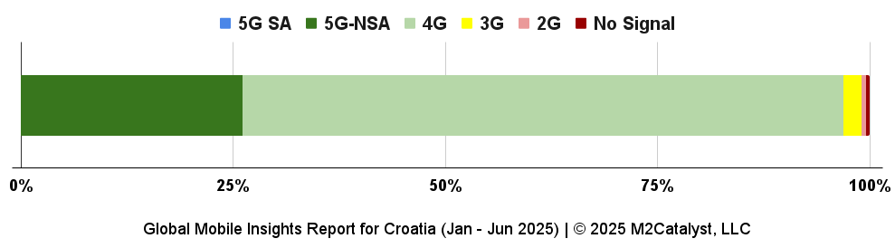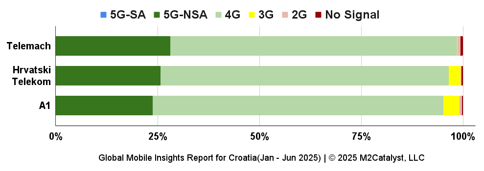 • Hrvatski Telekom and A1 show users reporting on the 3G network type with A1 reporting the highest percentage of 4%.