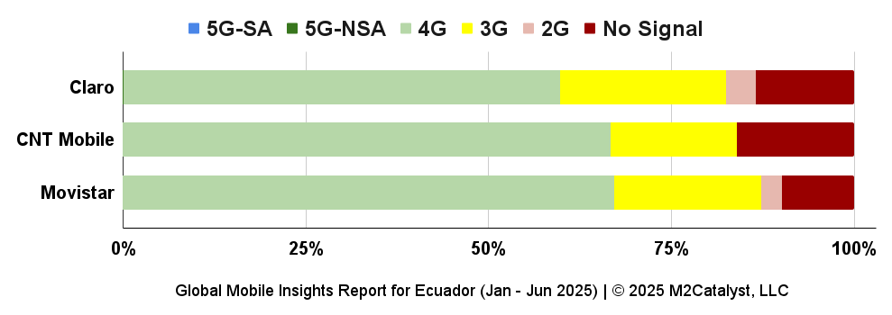 • Movistar has the lowest percentage with 10% of their users reporting no signal while CNT Mobile has the greatest percentage with 16% of their users reporting no signal.