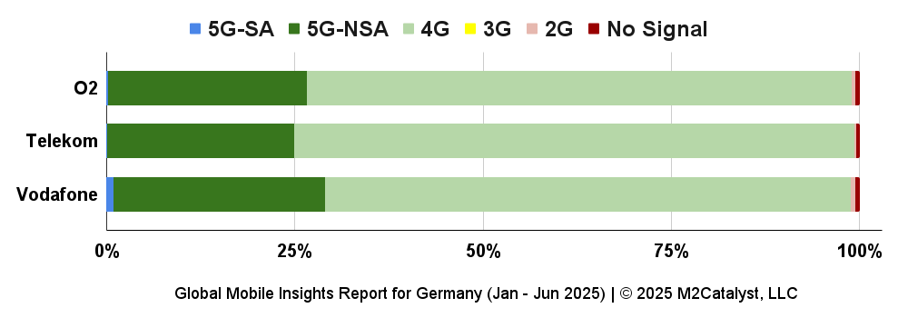 • Telekom shows the largest percentage of users on a network type of 4G or higher.