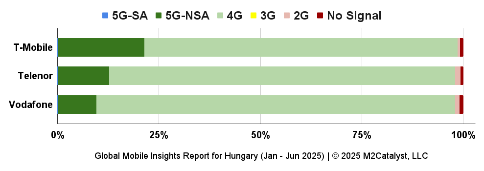 • All MNOs also have a relatively similar percentage of 98% to 99% of their users reporting on a network type of 4G or higher with T-Mobile having the largest 5G percentage.