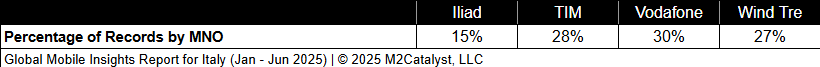 • TIM and Vodafone each show approximately 99% of users on a network type of 4G or higher.