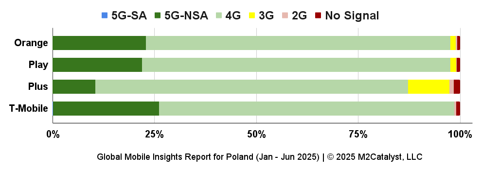 • Orange, Play, and T-Mobile have a relatively similar percentage of 98% to 99% of their users reporting on a network type of 4G or higher while Plus has the lowest percentage of its users on 4G or higher.