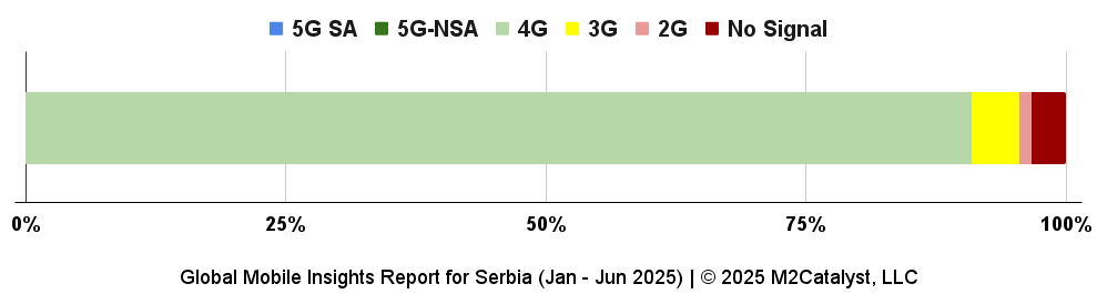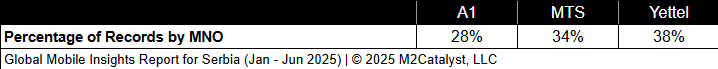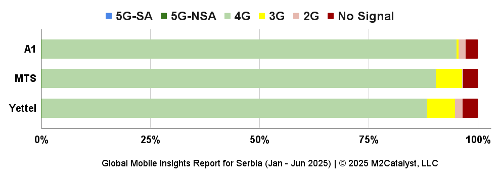 • A1 has 95% of its users reporting on a network type of 4G or higher while MTS and Yettel are at 90% and 88%, respectively. None of the MNOs in the study are reporting users on a 5G network type.