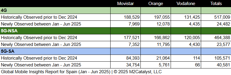 • The number of 5G-SA Cell IDs is approximately 46% of the newly observed Cell IDs with Movistar and Orange contributing over 99% of those.