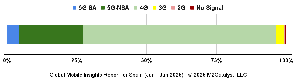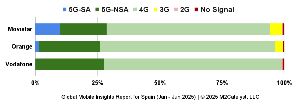 • Movistar and Orange each show approximately 10% and 1.5%, respectively, of users reporting on the 5G-SA network.