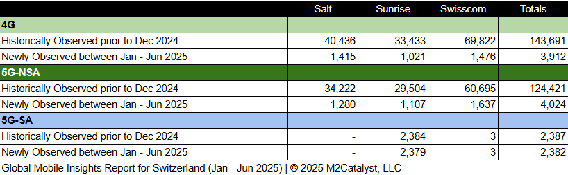 • The number of 5G-SA Cell IDs is approximately 23% of the newly observed Cell IDs with Sunrise contributing almost all of them.