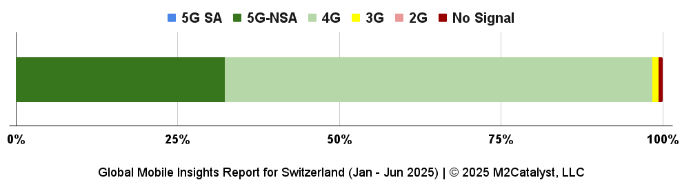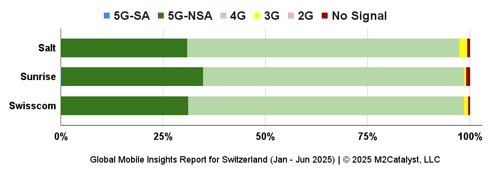 • All MNOs also have a relatively similar percentage of 97% to 99% of their users reporting on a network type of 4G or higher with Sunrise having the largest 5G percentage.