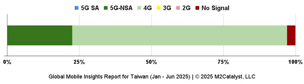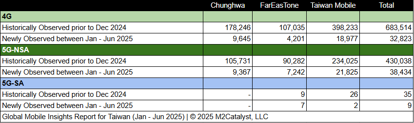 • The number of 5G-NSA Cell IDs is approximately 54% of the newly observed Cell IDs with Taiwan Mobile contributing over 57% of those.