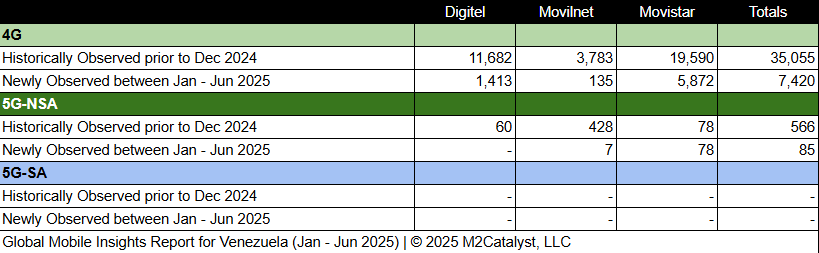 • M2’s dataset for the 1st half of 2025 contains 7,505 newly observed 4G/5G mobile broadband Cell IDs. A more in-depth view of the Cell IDs and their associated details by location over time can be visualized on M2's Crowd SiteIntel platform.