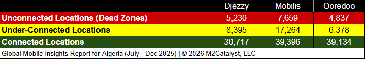 • Mobilis has the greatest under-connected location percentage at 27%, while all other MNOs range between 13% and 19%.