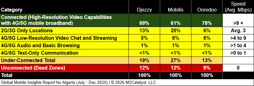 M2’s proprietary Mobile Broadband Quality algorithm comprehensively evaluates various factors, including signal strength, signal quality, and throughput, across (1) the 4G/5G service footprint for each country's national Mobile Network Operators (MNOs), (2) the 2G/3G-only service footprint for each MNO, and (3) areas where mobile devices are active but unable to detect any service. Within the M2 dataset, each 1km bin with mobile activity is then assessed to determine the highest mobile use case it can support, resulting in its classification as Connected, Under-Connected, or Unconnected.