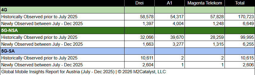 • M2’s dataset for the 2nd half of 2025 contains 15,510 newly observed 4G/5G mobile broadband Cell IDs. A more in-depth view of the Cell IDs and their associated details by location over time can be visualized on M2's Crowd SiteIntel platform.