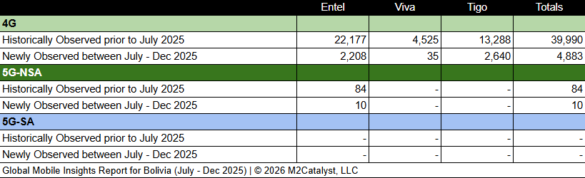 • M2’s dataset for the 2nd half of 2025 contains 4,893 newly observed 4G/5G mobile broadband Cell IDs. A more in-depth view of the Cell IDs and their associated details by location over time can be visualized on M2's Crowd SiteIntel platform.