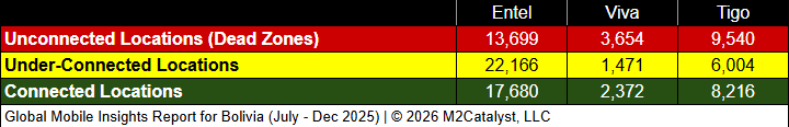 • Entel has the greatest under-connected location percentage at 41%, while the other MNOs range between 19% and 25%.