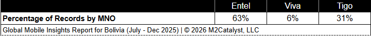 • Tigo has the greatest connected location percentage at 35%, while the other MNOs range between 32% and 33%.