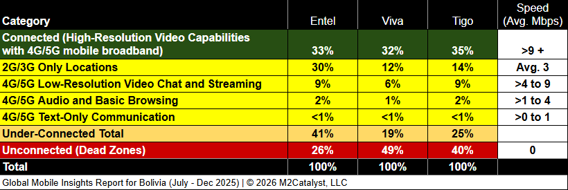 M2’s proprietary Mobile Broadband Quality algorithm comprehensively evaluates various factors, including signal strength, signal quality, and throughput, across (1) the 4G/5G service footprint for each country's national Mobile Network Operators (MNOs), (2) the 2G/3G-only service footprint for each MNO, and (3) areas where mobile devices are active but unable to detect any service. Within the M2 dataset, each 1km bin with mobile activity is then assessed to determine the highest mobile use case it can support, resulting in its classification as Connected, Under-Connected, or Unconnected.