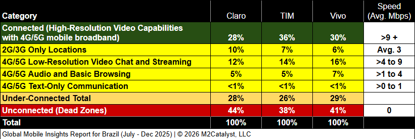 M2’s proprietary Mobile Broadband Quality algorithm comprehensively evaluates various factors, including signal strength, signal quality, and throughput, across (1) the 4G/5G service footprint for each country's national Mobile Network Operators (MNOs), (2) the 2G/3G-only service footprint for each MNO, and (3) areas where mobile devices are active but unable to detect any service. Within the M2 dataset, each 1km bin with mobile activity is then assessed to determine the highest mobile use case it can support, resulting in its classification as Connected, Under-Connected, or Unconnected.